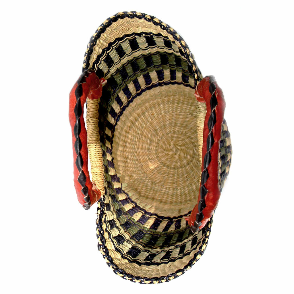 The U-shopper basket is the perfect tote, beach bag, shopper, everyday bag, or home decor basket. The beautiful bolga baskets are hand-woven in small villages of Ghana, a tradition passed down from generation to generation. They are woven out of renewable resources, including banana leaf and elephant grass, which grow abundantly in the region. Each basket is hand woven and 100% unique! The leather handle is treated using an all-natural process (either dyed and oiled or painted). Note that handle colors will vary and may range from black to an oiled red color. Variations are to be expected and treasured. Baskets are sturdy, strong, and flexible. If properly cared for, your basket will live a long life.
