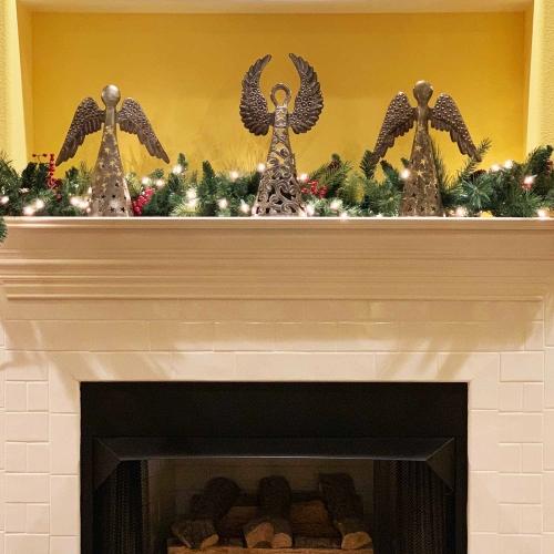 This metal art holiday angel is 14 inches tall, making a great decorative piece. The angel is large enough to be back lite with a candle. Handmade from steel drums.