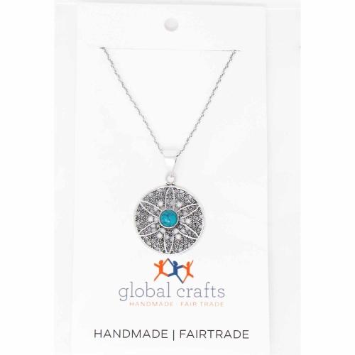 Combining modern styling with India tradition, this handcrafted jali pattern (openwork motif) round pendant is accented with a man-made turquoise center.