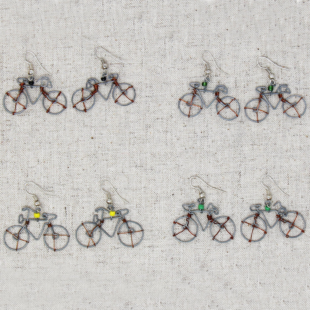 Made from recycled copper and steel wire, these earrings are inspired by a common mode of transportation in Western Kenya - the bicycle. Called "boda boda" by the locals, bicycles are used as public transportation (you ride on a padded rack on the back). The name "boda boda" comes from the bicycles' use for transporting people across the border between Uganda and Kenya rom border to border. These earrings feature a single bead separating the hypoallergenic hook from the bicycle. Earring is approximately 1.5 inches wide. Color of bead may vary from those shown.